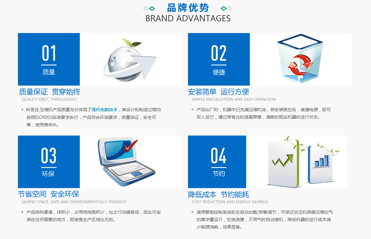 福州科普達機械有限公司,以ISO9001國際標準化質量認證體系整裝,確保為每一個用戶提供價值領先的壓縮空氣系統(tǒng)和技術服務,堅持創(chuàng)造空氣壓縮機領域的高端品質和高端價值!推出全系列高品質的節(jié)能變頻空壓機、雙螺桿式空壓機、活塞式空氣壓縮機以及壓縮空氣成套設備和系統(tǒng)服務。 科普達將以質量求生存,以科技創(chuàng)新求發(fā)展,以現(xiàn)代化管理求效益,堅持出精品、造品牌、創(chuàng)優(yōu)質、守信譽,以客戶為上帝的宗旨,專注打造中國壓縮機領域中的航空級企業(yè)。福州科普達機械有限公司,以ISO9001國際標準化質量認證體系整裝,確保為每一個用戶提供價值領先的壓縮空氣系統(tǒng)和技術服務,堅持創(chuàng)造空氣壓縮機領域的高端品質和高端價值!推出全系列高品質的節(jié)能變頻空壓機、雙螺桿式空壓機、活塞式空氣壓縮機以及壓縮空氣成套設備和系統(tǒng)服務。 科普達將以質量求生存,以科技創(chuàng)新求發(fā)展,以現(xiàn)代化管理求效益,堅持出精品、造品牌、創(chuàng)優(yōu)質、守信譽,以客戶為上帝的宗旨,專注打造中國壓縮機領域中的航空級企業(yè)。>>更多